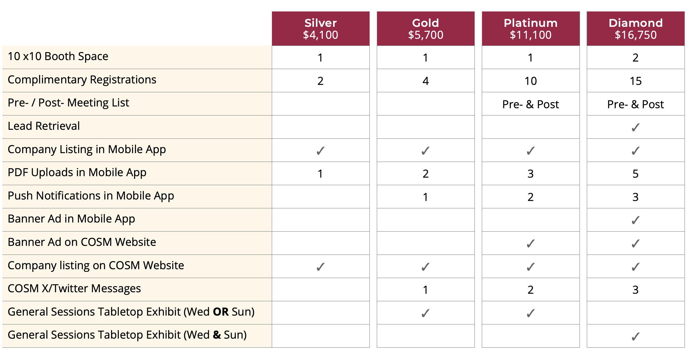 Platinum | $10,500 One 10×10 booth with pipe, drape and ID sign, General Session tabletop exhibit on Wednesday or Sunday, ten (10) complimentary registrations, company logo, description (up to 150 words), contact details included on the meeting app, up to four (4) PDF documents in meeting app, company ad on COSM website, company name and website on COSM website, up to (2) scheduled push notification through the meeting app, two (2) tweet messages, and pre-meeting attendee list.