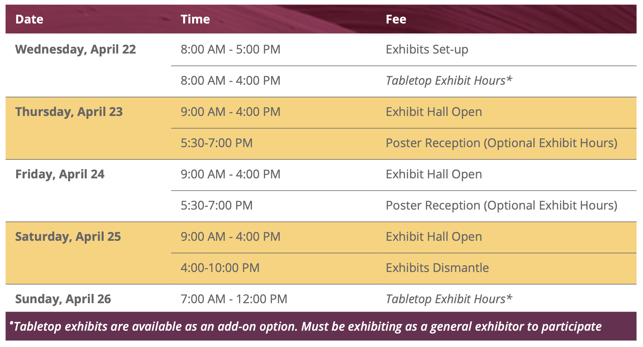 OPTION 1 | $3,750 Tabletop Exhibit on Wednesday, April 22 AND Sunday, April 26